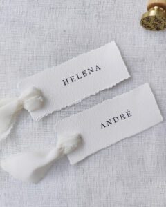Pour personnaliser vos marque-places, plusieurs finitions sont disponibles selon vos envies : un délicat cachet de cire floral couleur bronze, un ruban en mousseline de soie au tombé aérien, ou l’association des deux pour une finition encore plus précieuse et sophistiquée.