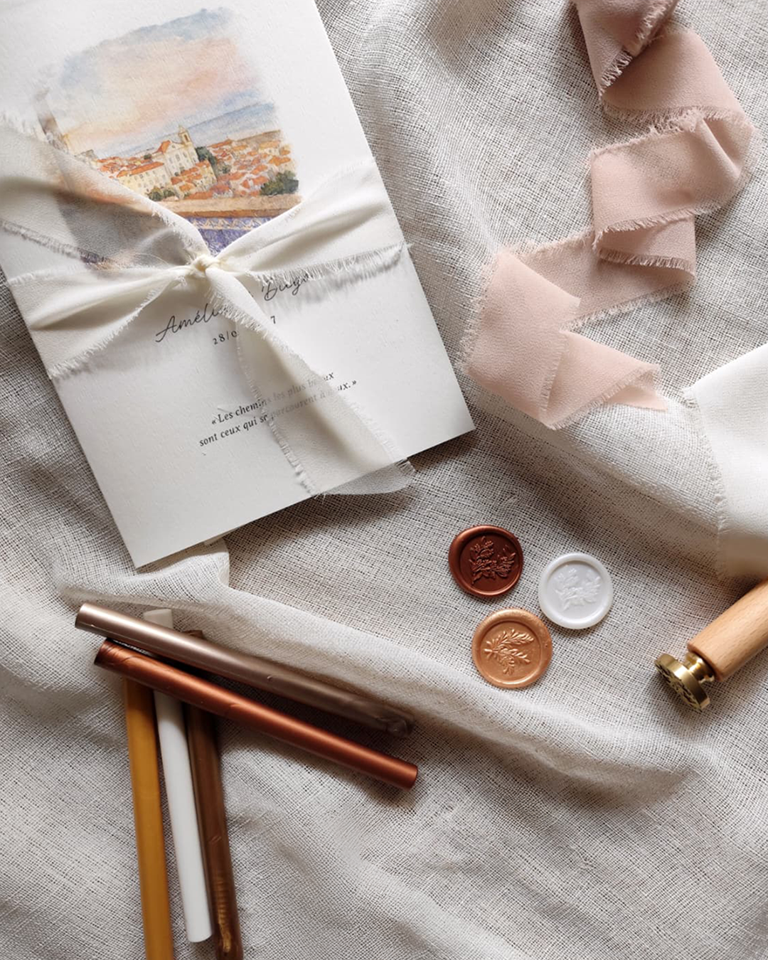 En créant la papeterie de mon propre mariage, une petite graine s’est semée et a grandi délicatement. J’ai découvert ce que le graphisme avait de plus beau : la matière, le geste, les finitions, la texture.