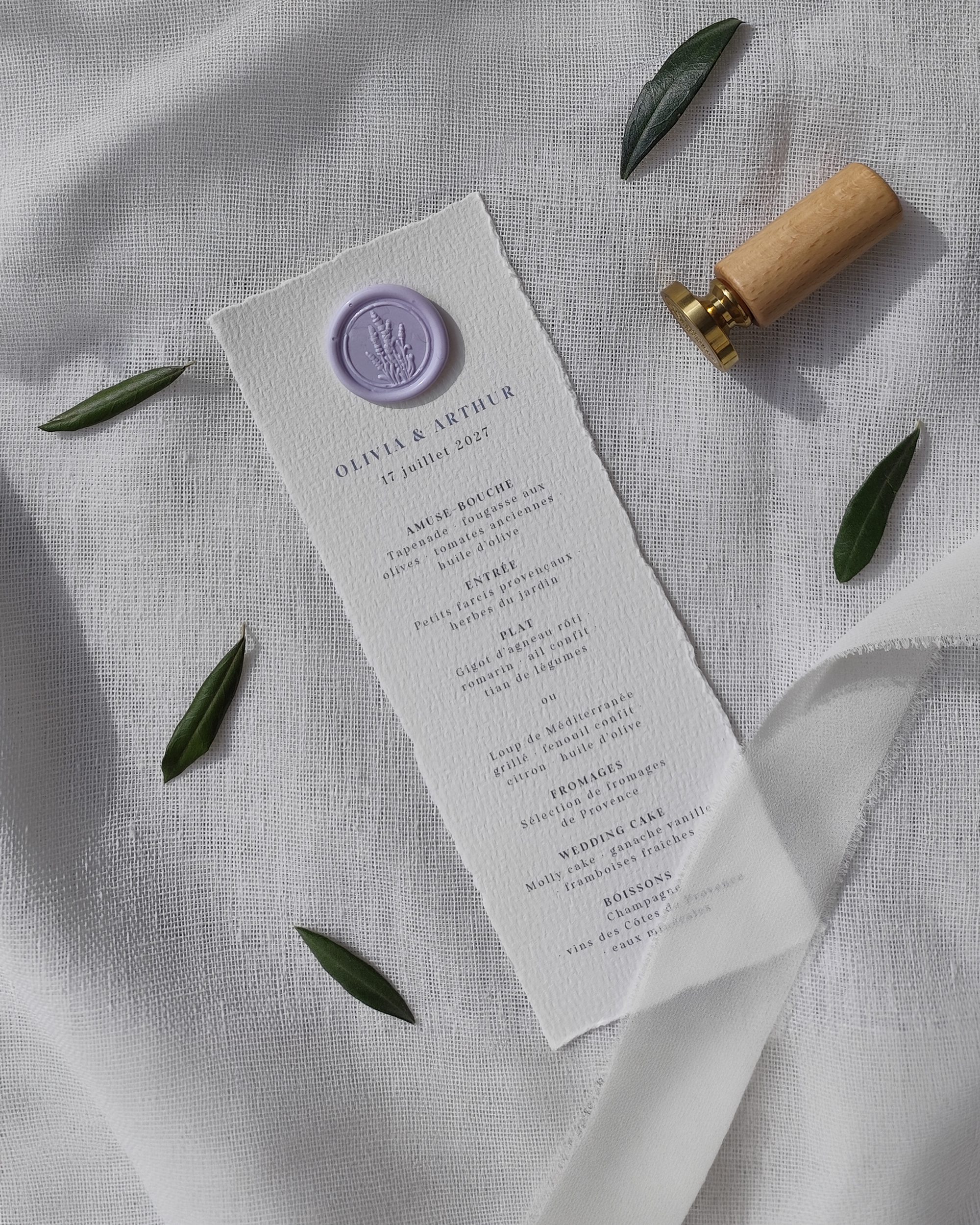 Em continuidade com o convite da coleção Provença, o seu lacre de cera confere relevo e sofisticação ao menu de casamento. A sua delicada tonalidade lavanda evoca os campos em flor, o perfume do verão e a atmosfera acolhedora da Provença francesa.