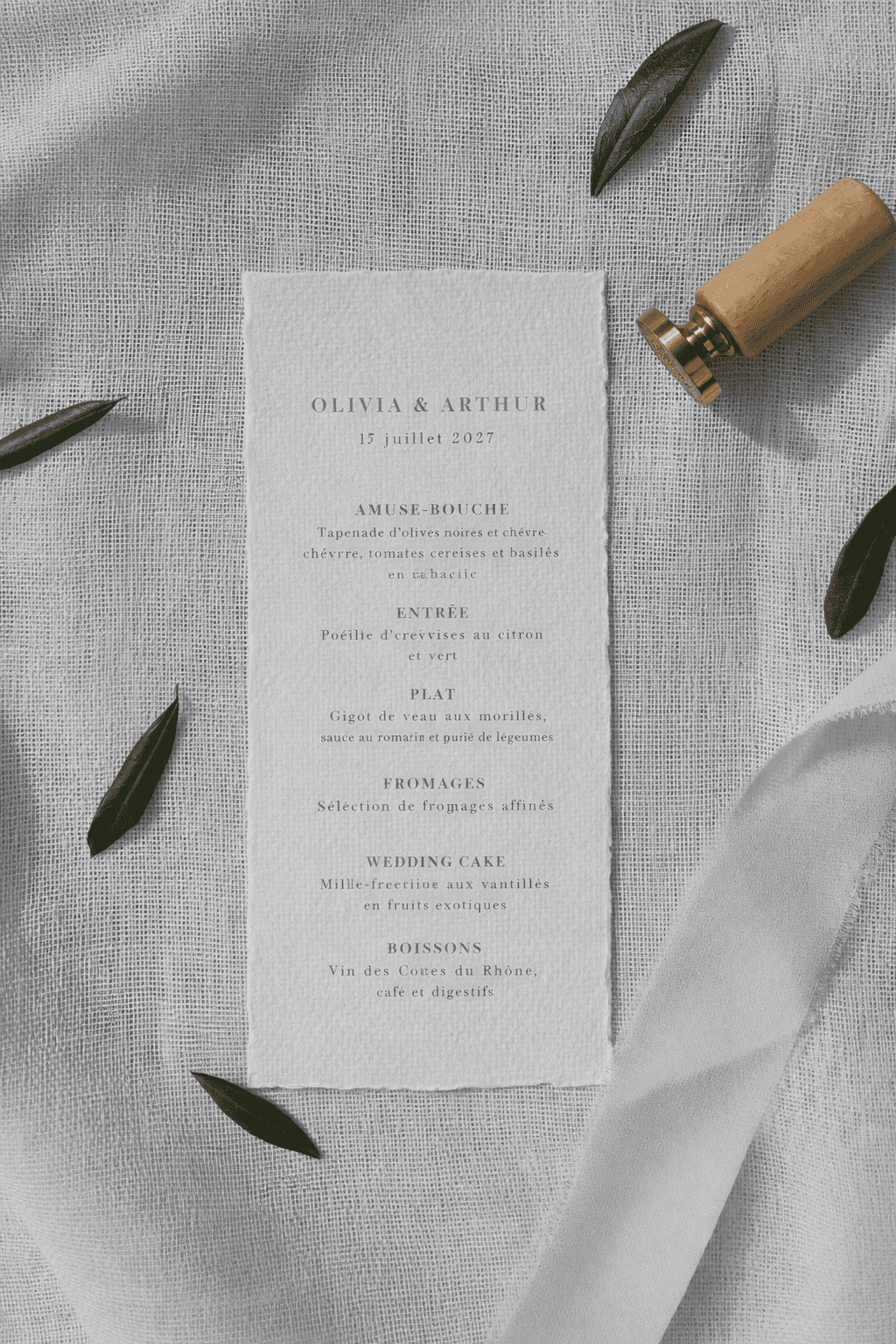 A ementa de casamento da coleção Provença é impressa em papel de algodão de alta qualidade com bordas irregulares. Distingue-se pelo seu aspeto texturado e artesanal, perfeito para uma decoração de mesa luminosa e harmoniosa.