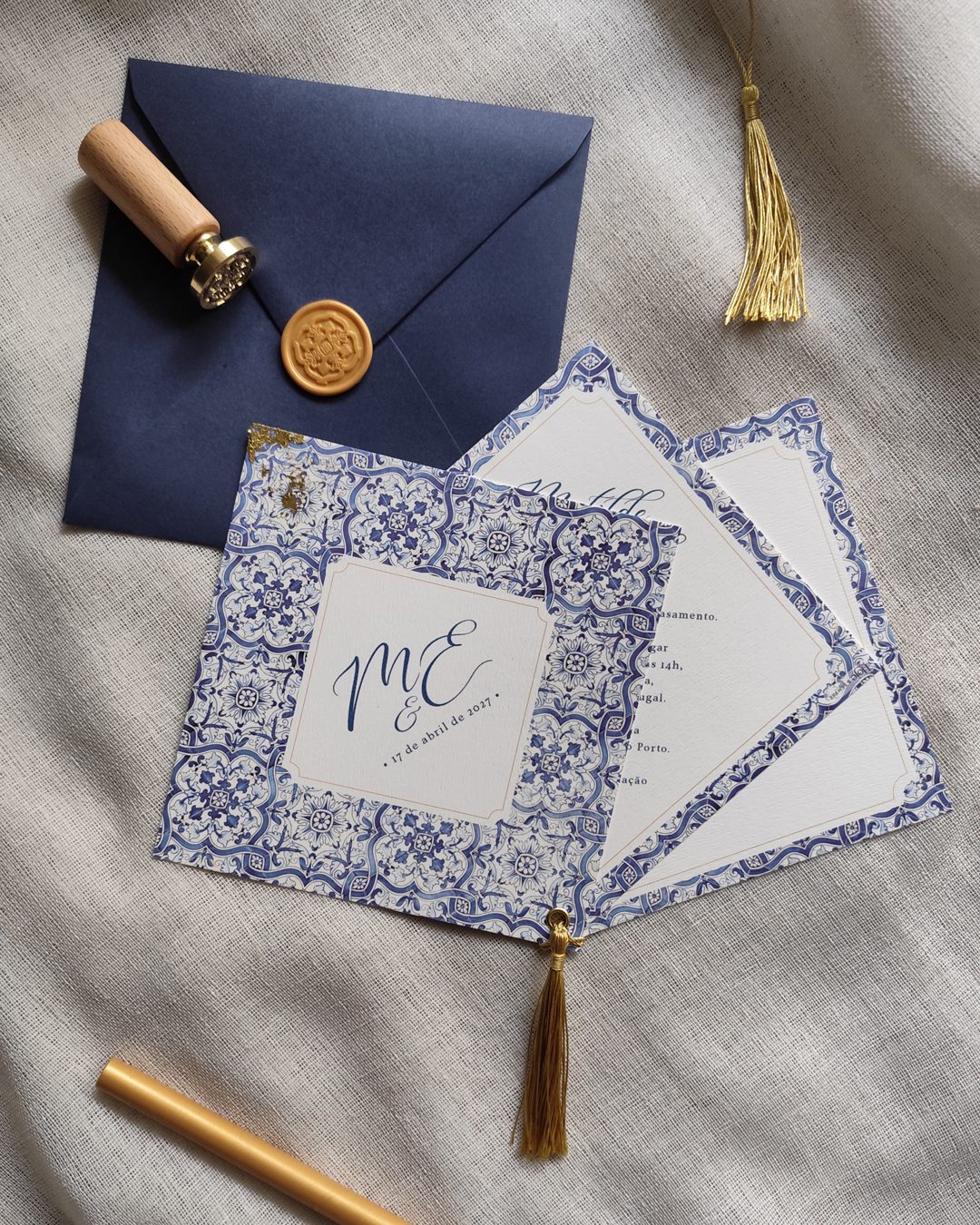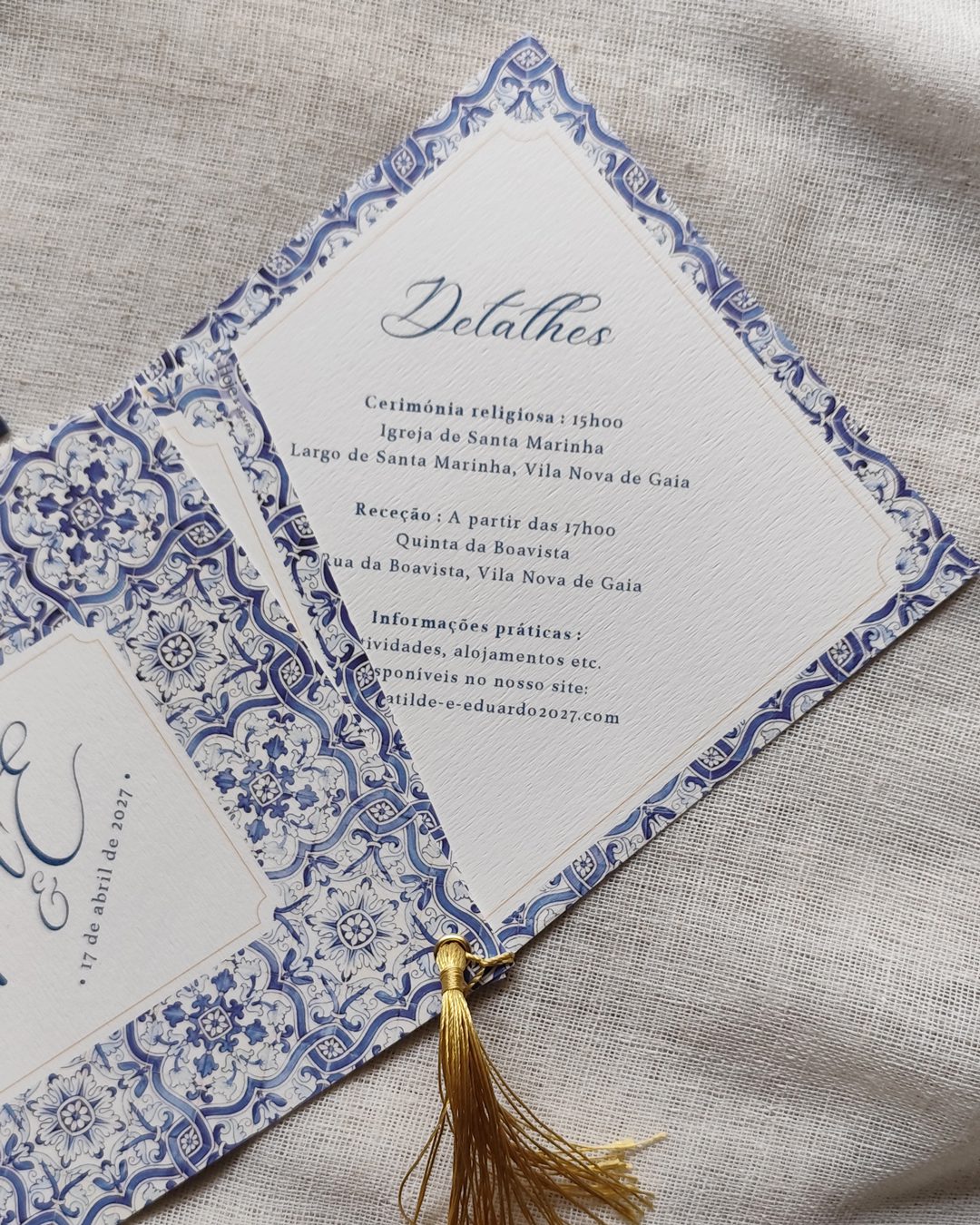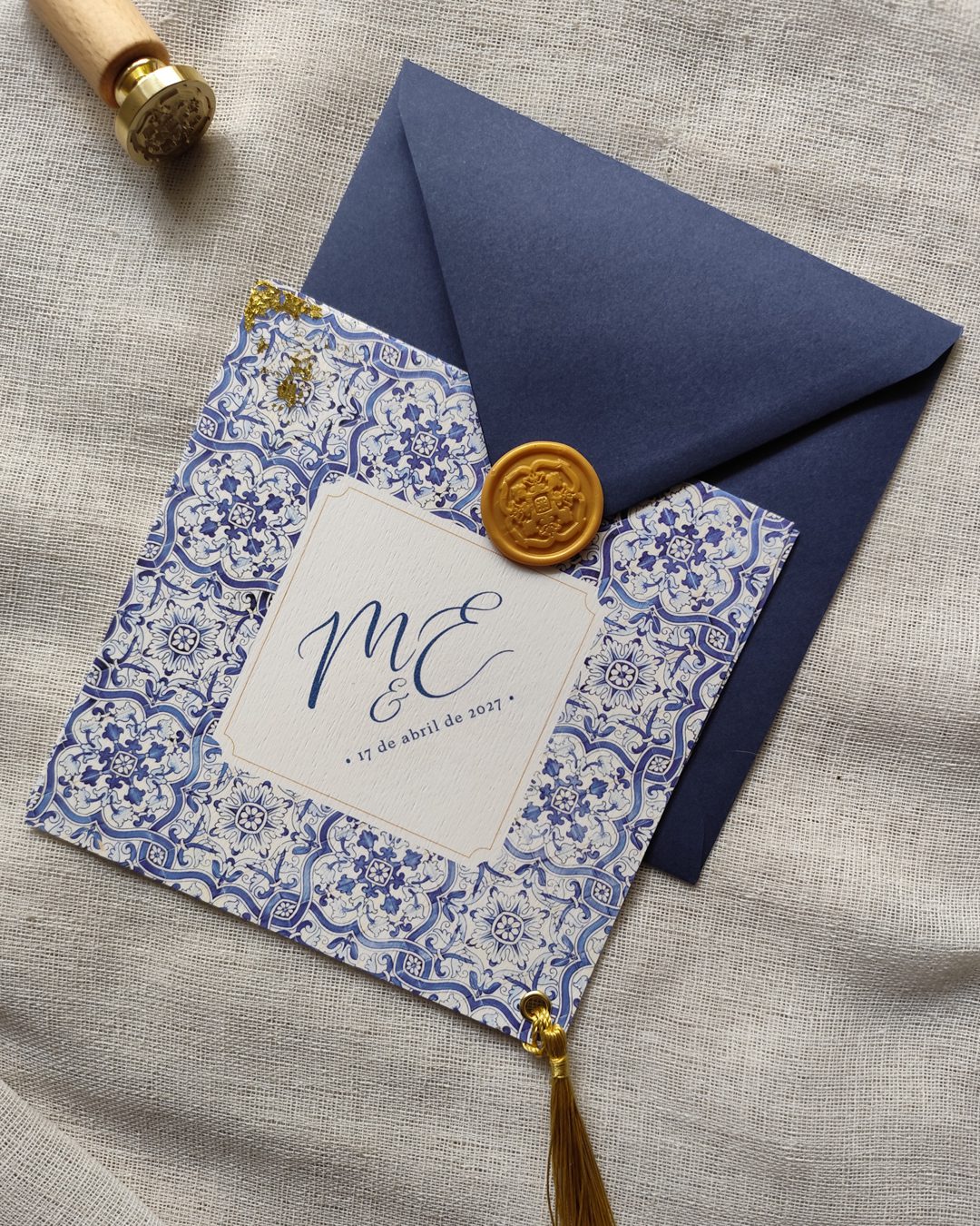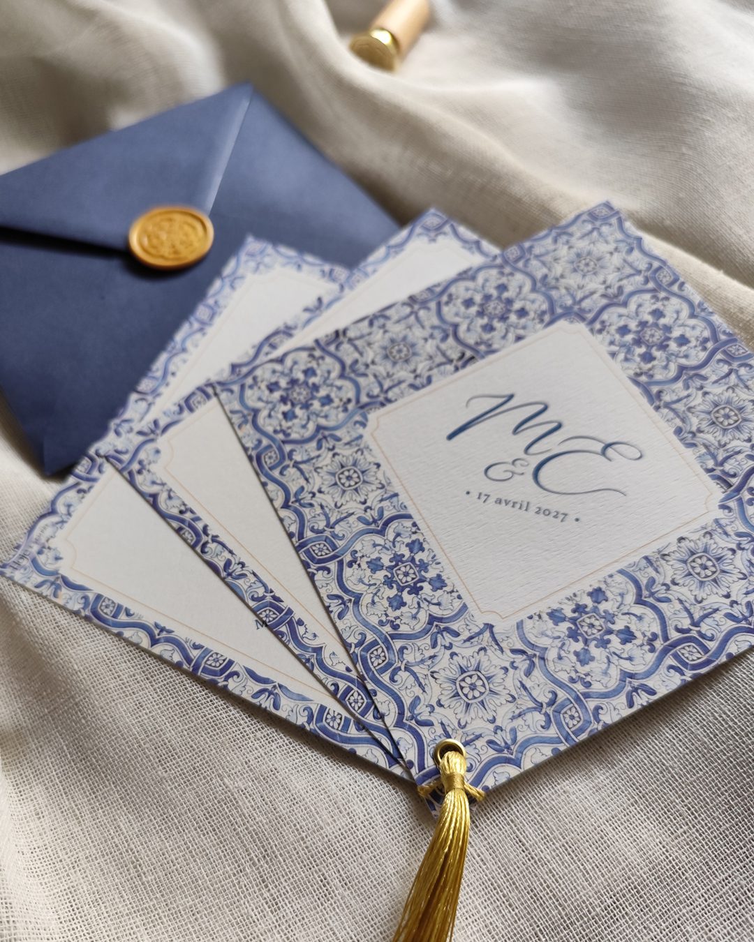 Motifs Azulejo, tons bleu profonds et quelques détails or composent un faire-part élégant et traditionnel, parfait pour une célébration sincère et pleine d’émotion.