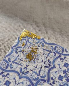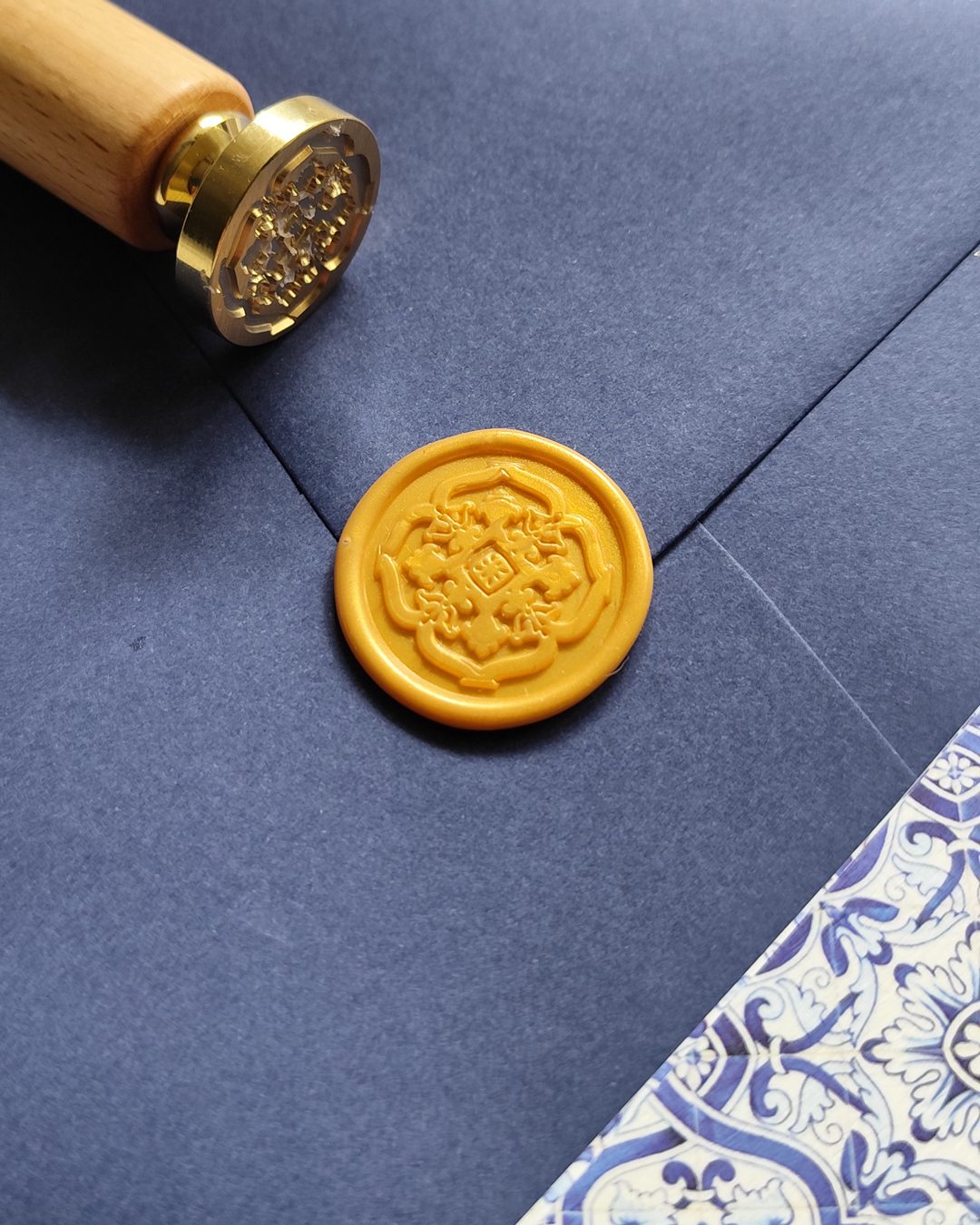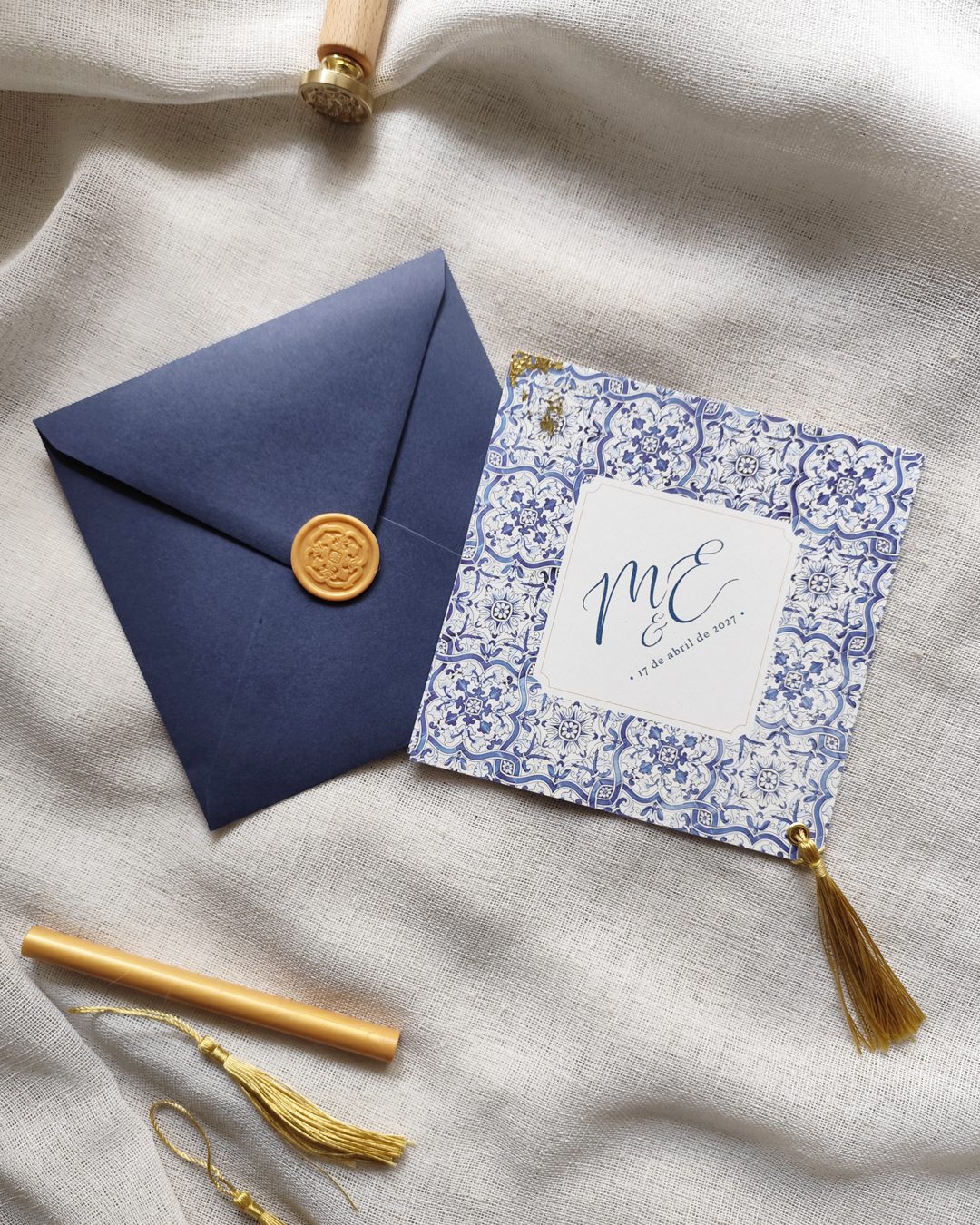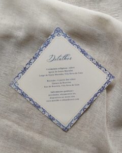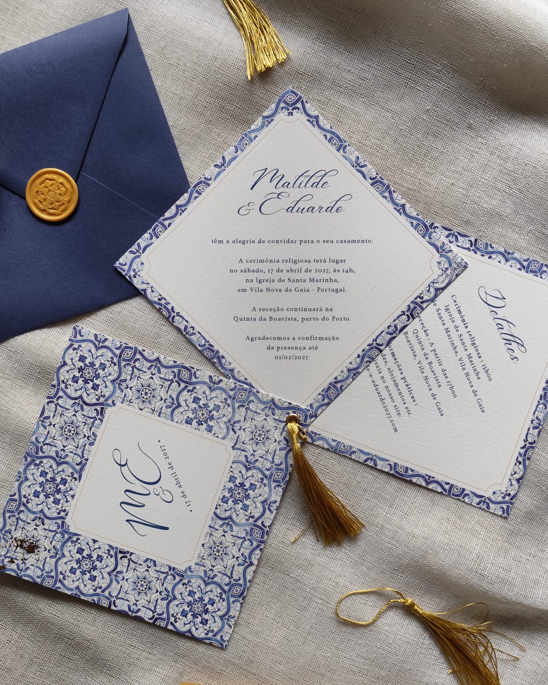 Motifs Azulejo, tons bleu profonds et quelques détails or composent un faire-part élégant et traditionnel, parfait pour une célébration sincère et pleine d’émotion.