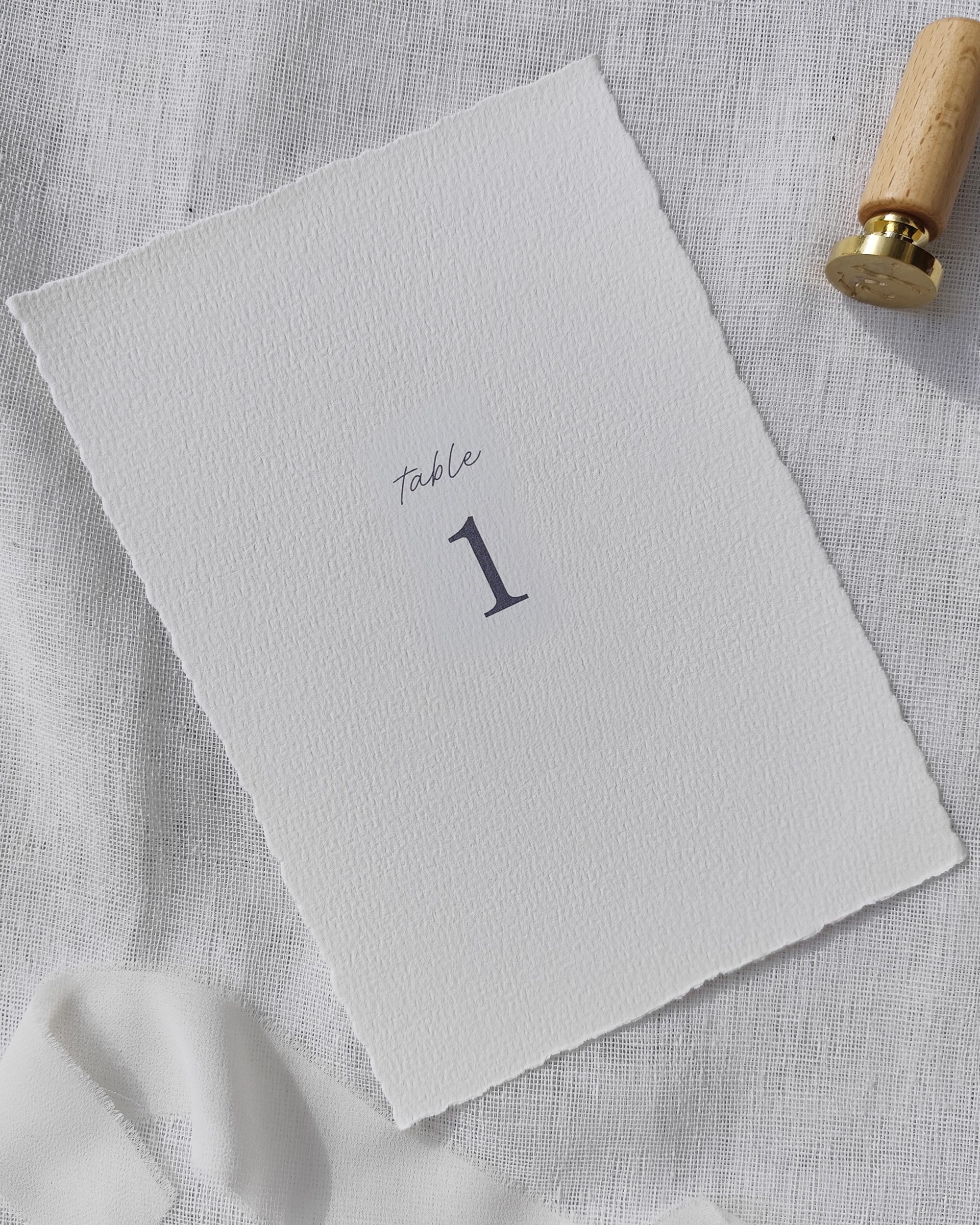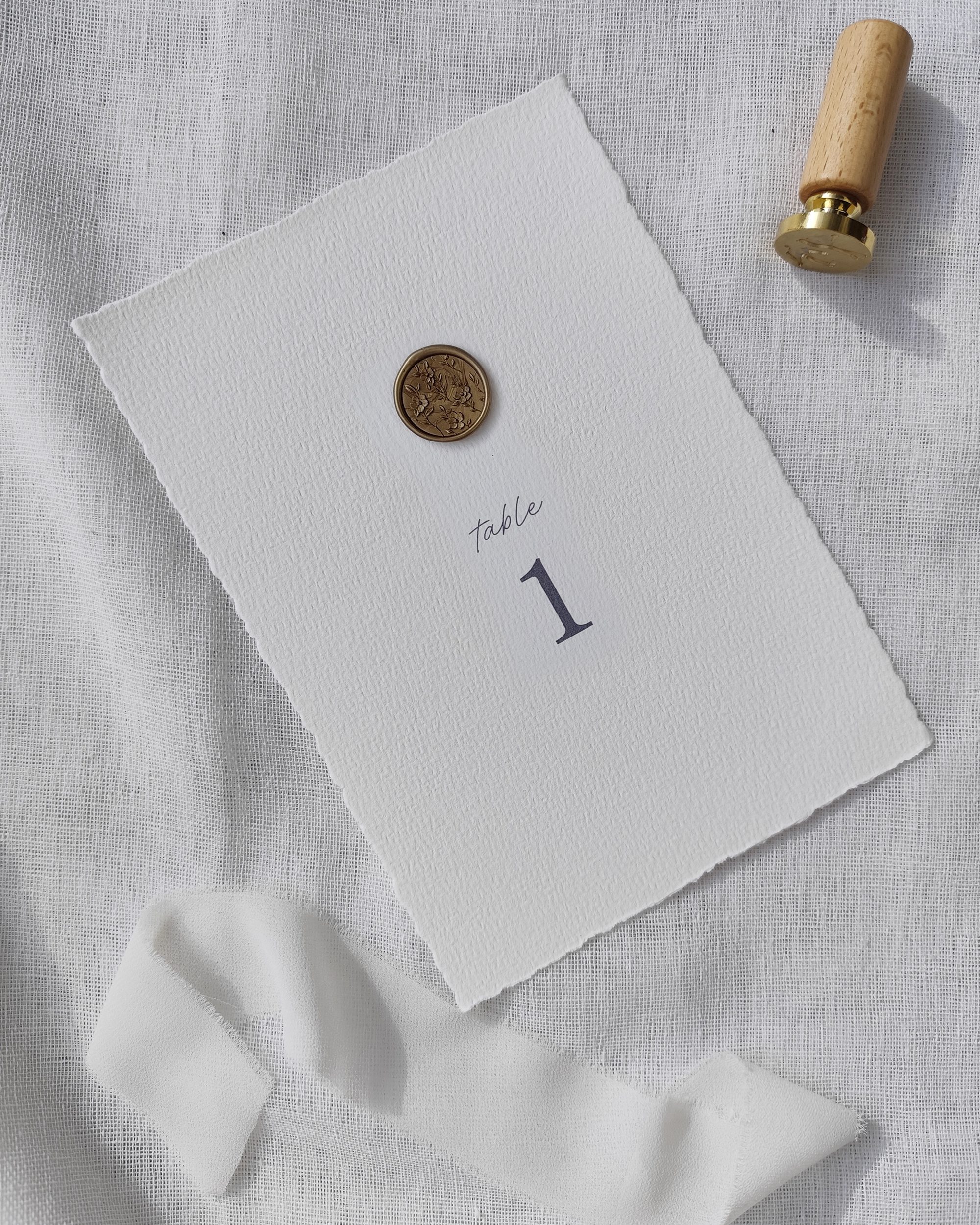 O seu design destaca cada número de mesa com simplicidade, acrescentando um toque leve e elegante à sua decoração. Está disponível um selo de cera floral em bronze opcional para um acabamento sofisticado. Sem esta opção, o layout é cuidadosamente concebido com texto perfeitamente centrado, tanto na horizontal como na vertical, para um resultado equilibrado e minimalista.
