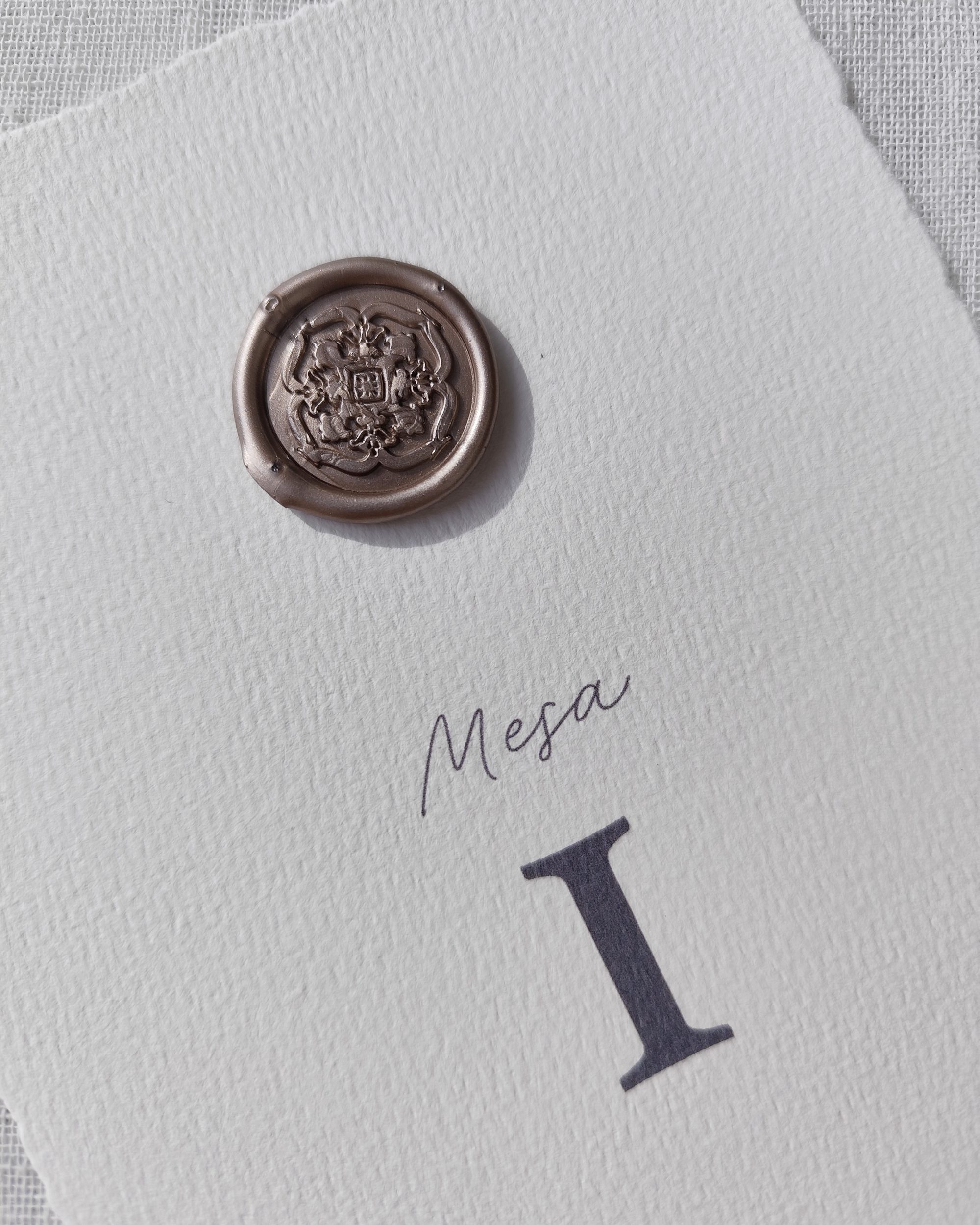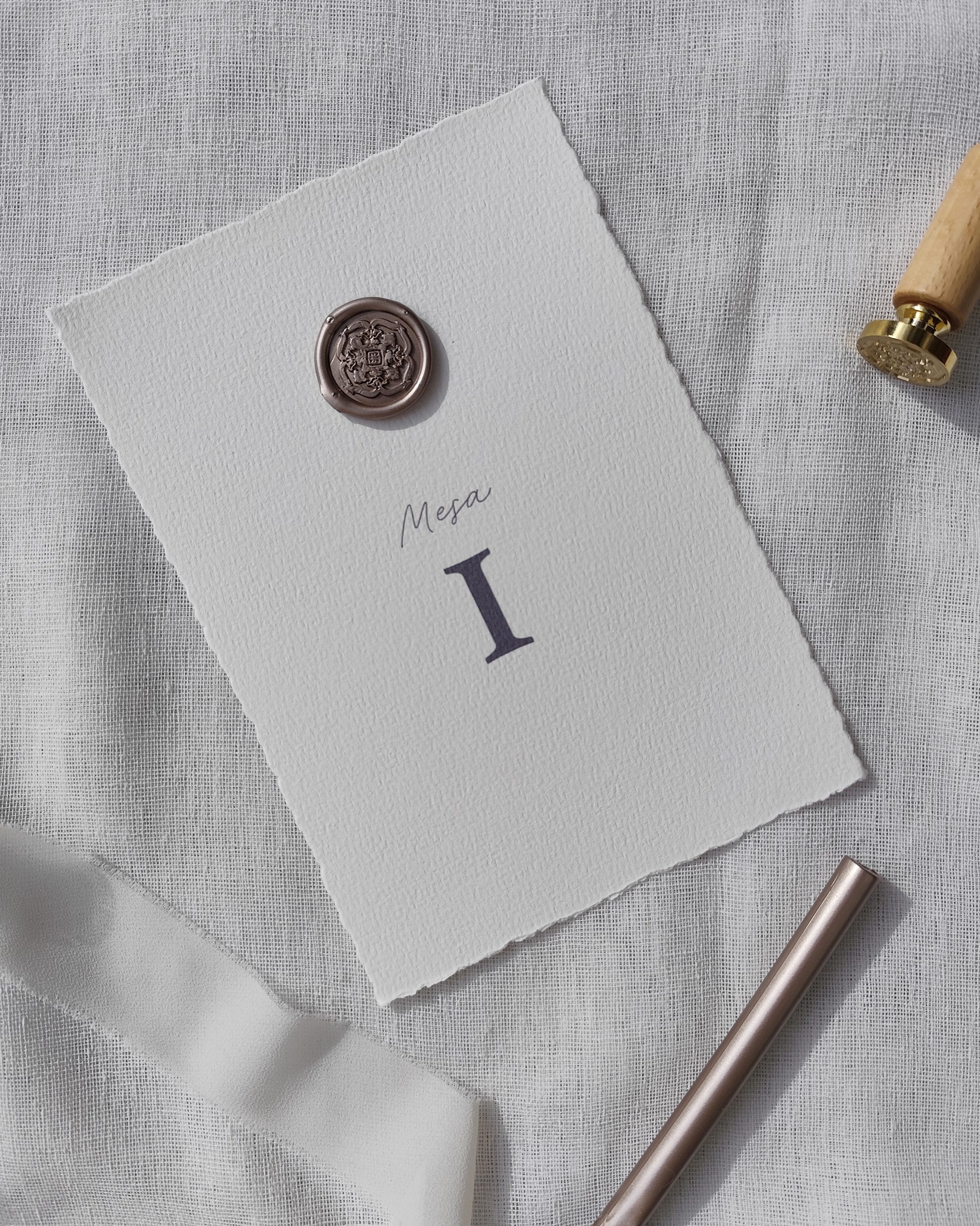 Em perfeita continuidade com o convite da coleção Lisboa e o resto da papelaria a condizer, este número de mesa distingue-se pelo seu lacre de cera com um motivo inspirado nos azulejos portugueses, um elemento emblemático e intemporal que evoca o património cultural de Portugal. Este detalhe confere um toque simultaneamente tradicional e requintado à sua receção.