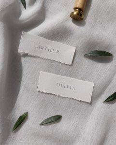 Os marcadores de lugar «Provença» combinam na perfeição com todo o conjunto de artigos de papelaria da coleção. Permitem indicar o lugar de cada um dos seus convidados no dia do casamento. Pode dispô-los conforme as suas preferências, utilizando um suporte para cartões ou simplesmente colocando-os com elegância sobre a mesa. São ideais para um casamento no meio das oliveiras e com lavanda e enfeitar as mesas. Impresso em papel de algodão de alta qualidade com bordas irregulares, seduz pelo seu aspeto texturado e artesanal.