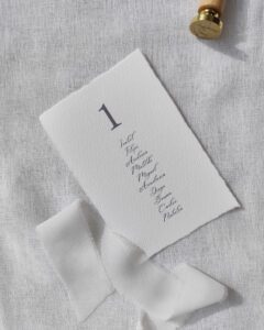 O placard de mesas «Coimbra» combina com o resto da papelaria da coleção, criando um efeito harmonioso e elegante. Permite-lhe indicar onde os seus convidados se sentarão no dia do casamento. Disponha-os como desejar, por exemplo, sobre um espelho ou numa placa de acrílico.
