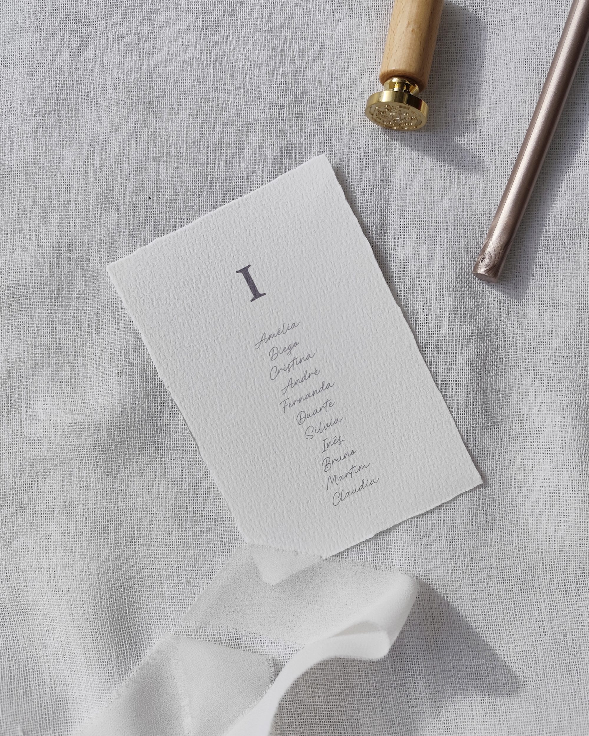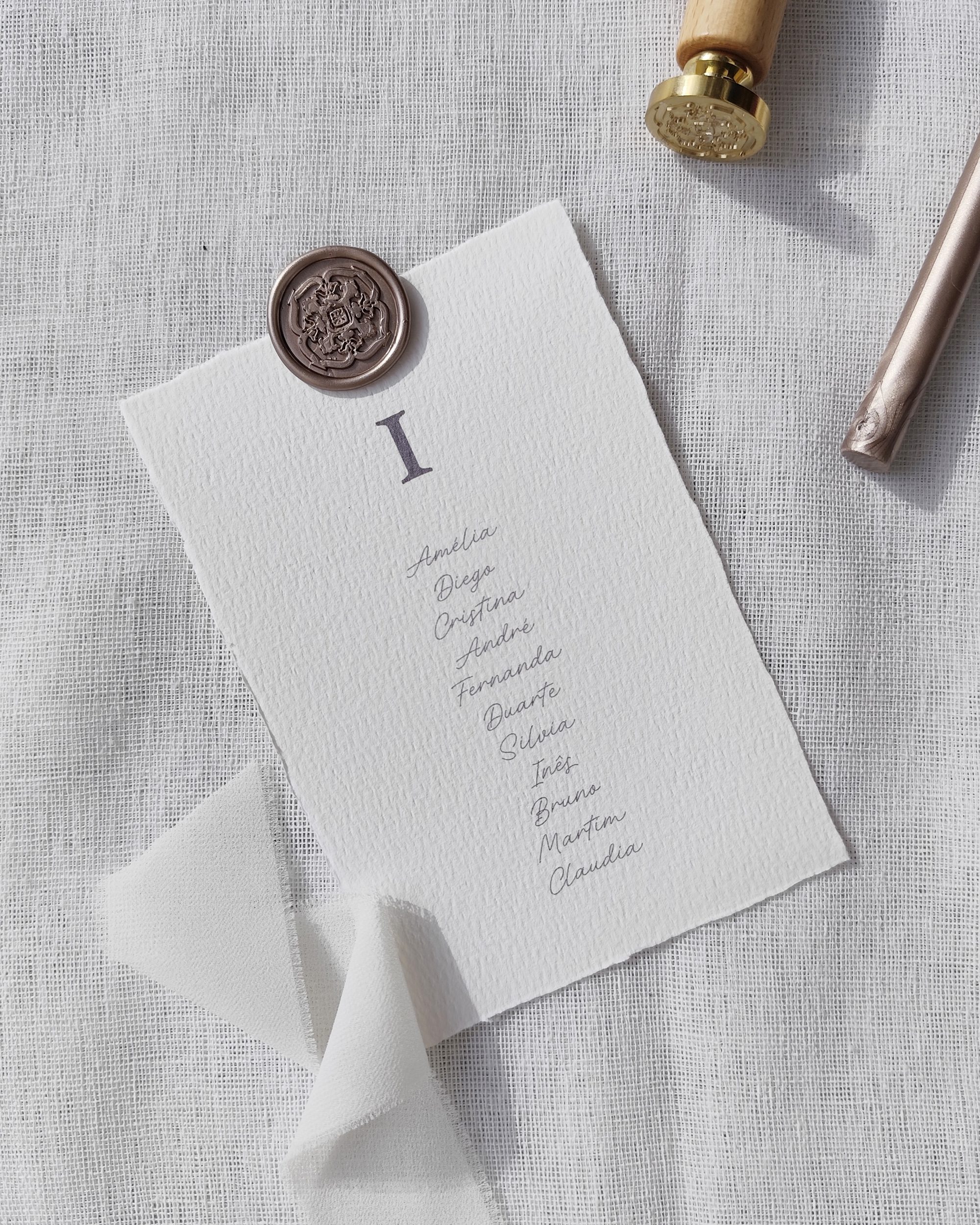 Este placard de mesas, a condizer com o resto da papelaria da mesma coleção, distingue-se pelo seu lacre de cera com um motivo inspirado nos azulejos portugueses, um elemento emblemático e intemporal que evoca o património cultural de Portugal. Este pormenor confere um toque simultaneamente tradicional e requintado à sua receção.