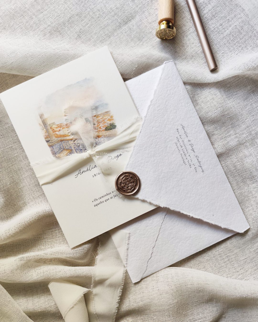 – 1 caixa principal de cartão, tamanho A5 fechada, tamanho A4 aberta, com 1 dobra, impressa a cores em ambos os lados em papel texturizado grosso de 320g – 1 envelope de papel de algodão grosso cor marfim, tamanho C5
